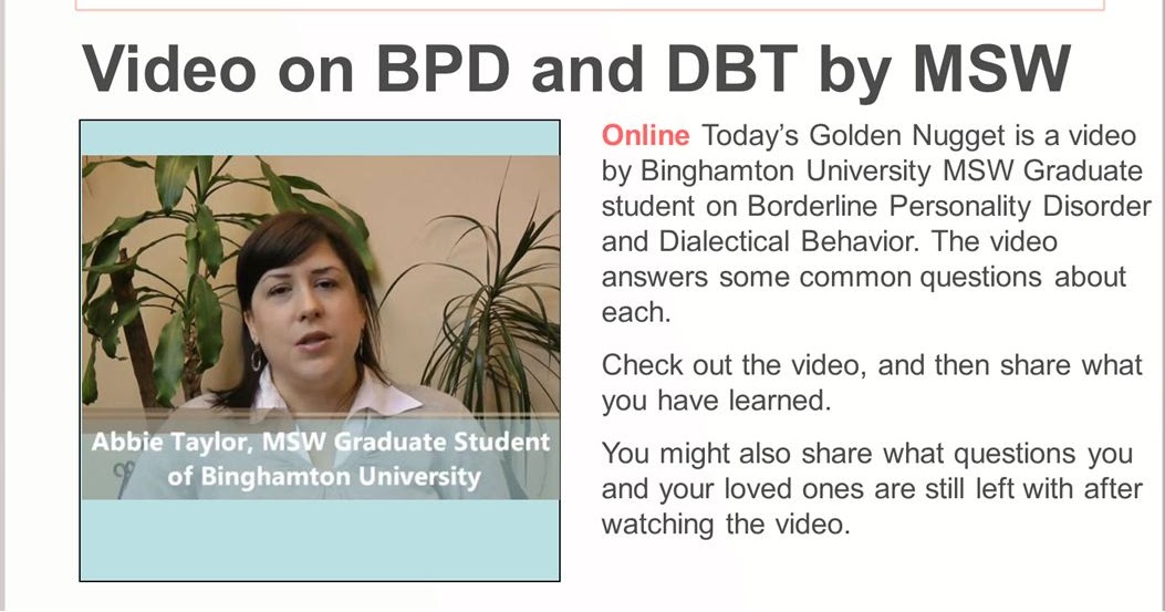Learn more about Borderline Personality Disorder Treatment options at Psych Central. Read about treatment options, symptoms, resources, and forums. All of the following are common disorders that tend to be comorbid with borderline personality disorder the therapist has given Jill homework assignments. DBT Mindfulness Exercise (Homework Assignment #1) Adapted from Marsha M. Linehan's Skills Training Manual for Treating Borderline Personality Disorder.
